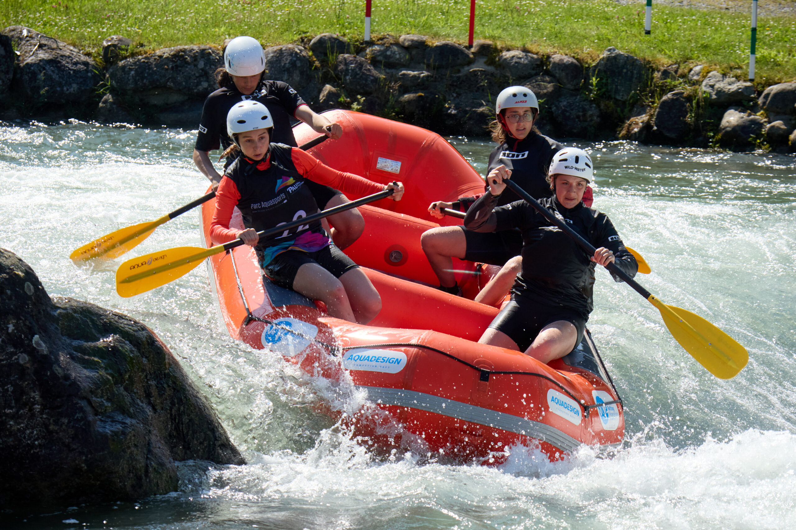 A quatre dans un raft les รฉquipes devront sโaffronter sur trois รฉpreuves : le sprint, le slalom et le Raft Cross.